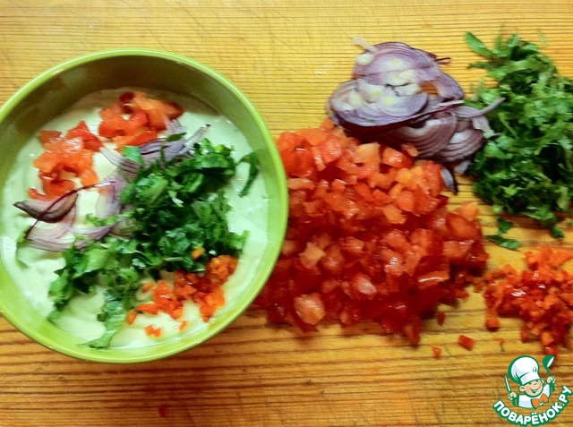 Из помидора удалим мякоть с семечками и мелко его нарежем. Красный лук нарежем тонкими полукольцами, листья кинзы измельчим. Из перца чили удалим семена и тоже мелко его нарежем. Добавим овощи в соус.