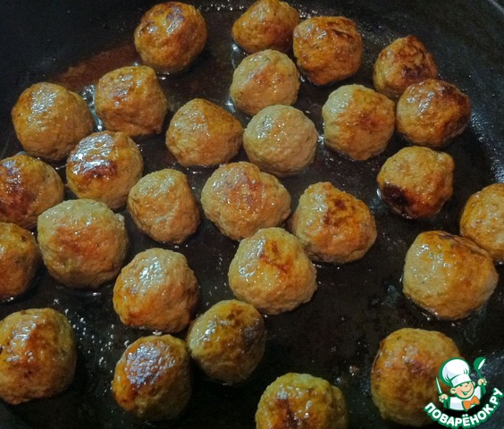 Шарики достаём из холодильника и обжариваем до корочки на небольшом огне примерно минут 10. Затем подержим их под крышкой ещё минут 5.