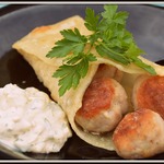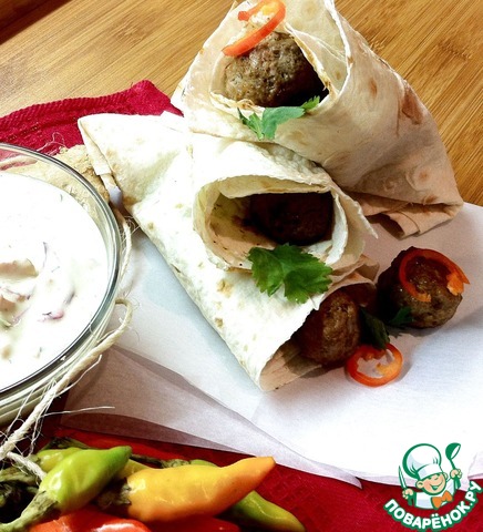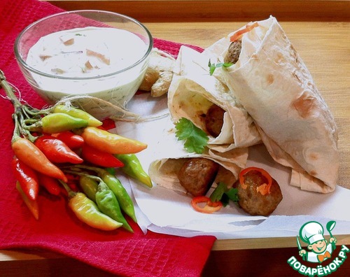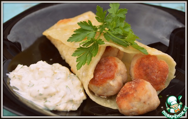 Начиняем кулёчки из лаваша шариками и подаём с соусом.