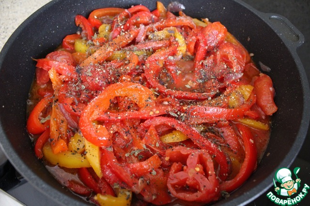 Добавляю полоски перца и продолжаю готовить овощную смесь еще 30 минут, помешивая время от времени.