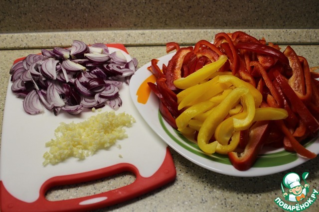 Перец нарезаю длинными тонкими (5 - 8 мм) полосками, лук - перьями, чеснок - мелко.
