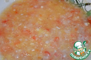 Для соуса на мелкой терке натереть сырой картофель, лук, чеснок и половинку помидора измельчить. Залить все половиной стакана отвара, поперчить по вкусу.