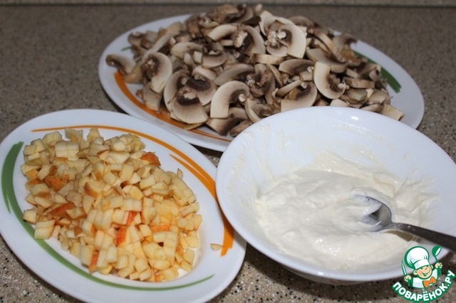 Нарезаем грибы ломтиками, яблоки (удаляем сердцевину) - мелкими кубиками, муку смешать со сметаной.