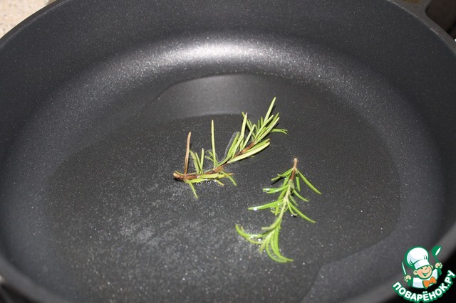 В разогретом оливковом масле обжариваем веточку розмарина (сломала на две части) приблизительно 2 - 3 минуты.