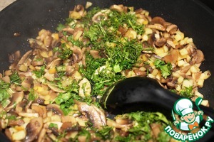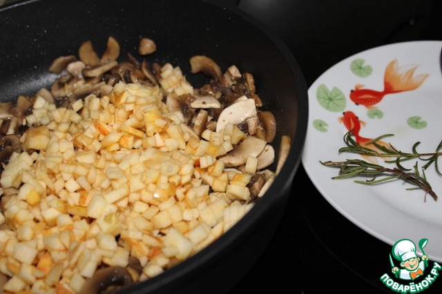Убираем со сковороды розмарин и обжариваем грибы 10 - 12 минут, затем добавляем нарезанное яблоко и жарим, помешивая еще 5 минут. За это время кусочки яблока станут мягкими.
