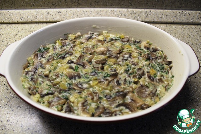 Предлагаю попробовать очень нежную грибную запеканку, которая особенно вкусна под сырно-чесночным майонезным соусом.