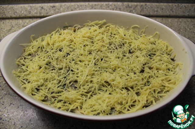 Сверху грибы посыпаем частью тертого сыра, приблизительно используем треть от общего объема..