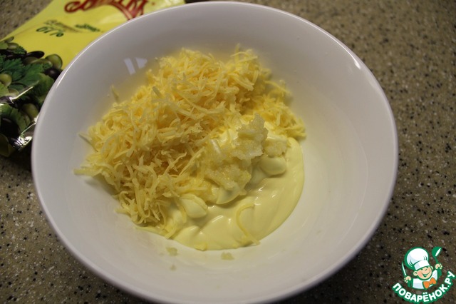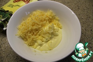 Пока грибы запекаются, готовим соус: сешиваем майонез с натертым сыром и чесноком.