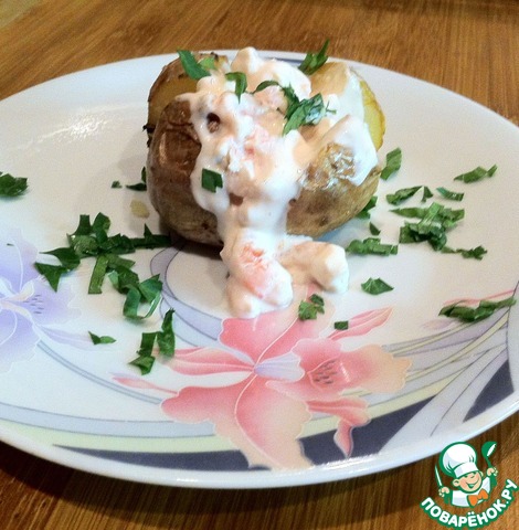 Jacket potato with shrimps. Запеките картошку по этому рецепту, и она у вас получится идеальной – с хрустящей корочкой и тающей, нежной мякотью. Но все же главный акцент этого блюда – это салат с креветками и майонезом, а картофель служит благодарной основой. Такой картофель в Англии дают детям, и они его очень любят. Начинки бывают самыми разнообразными, от фасоли до тунца, креветок и лосося.