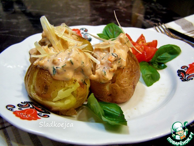 Еще хороший вариант - сливочный сыр немного развести молоком, приправить травами и чесноком (или любыми другими приправами по вкусу), и когда картошка будет почти готова, но еще слегка твердовата, надрезать ее, заправить этим соусом и допечь. Можно еще тертым сыром сверху посыпать.