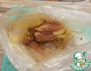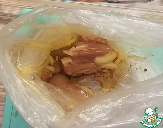 Берём куриное филе, промываем и складываем в двойной полиэтиленовый пакет, закатываем края и начинаем составлять маринад сразу по месту -