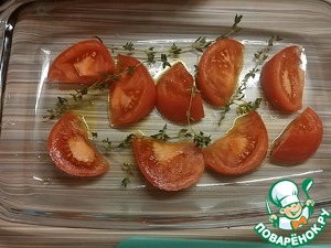 Режем помидор на дольки и кладём на дно, кидаем сверху тимьян и розмарин.