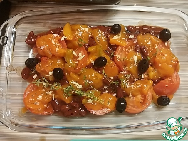 кидаем оливки ещё тимьян и мелко порубленную дольку чеснока
