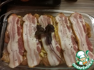 Последнее желание курицы перед запеканием выполнено, мы укрываем её беконом.