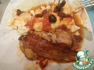 Отдельно разогреваем гарнир (у меня пюре) и выкладываем на тарелку.