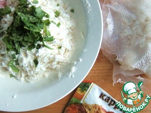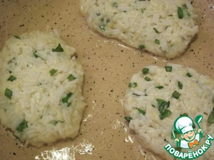 Смешать отварной рис с рубленным базиликом, специями, мукой и добавить 3-4 ст. л. воды до вязкой консистенции. Формировать лепешки удобно мокрыми руками.