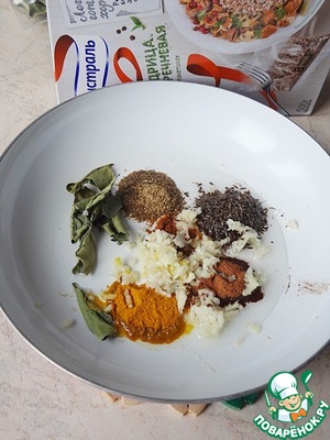 Разогрейте растительное масло в сковороде и добавьте все специи. Чеснок предварительно измельчите. Перемешайте, подержите минутку на огне.