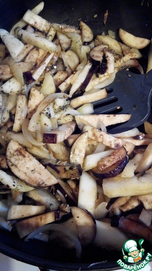 Добавляем баклажаны и цуккини, нарезанные брусочками. Добавляем листики розмарина. Обжариваем 10-15 минут на среднем огне, периодически помешивая. -
