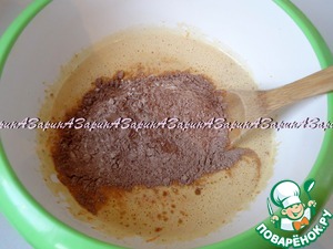 Обойную муку смешать с какао и просеять к жидким ингредиентам. Аккуратно с помощью лопатки вымесить тесто.