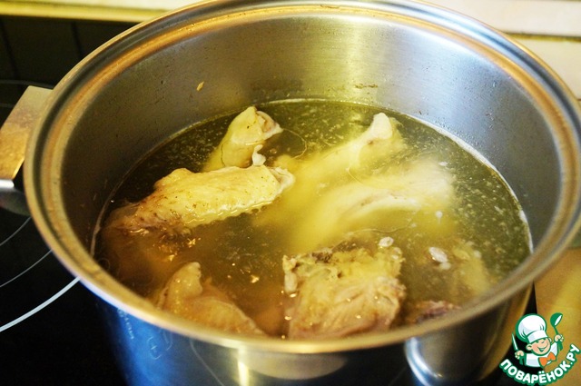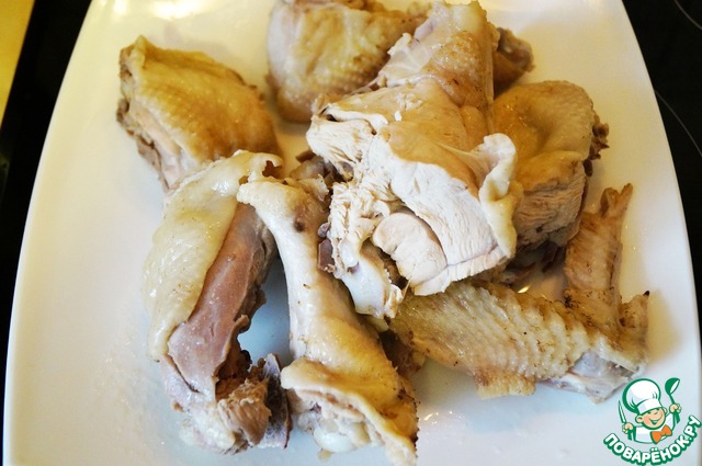 Рубим курицу на куски, обрезаем жир и варим до полной готовности. Солим по вкусу.