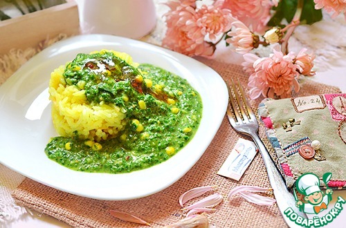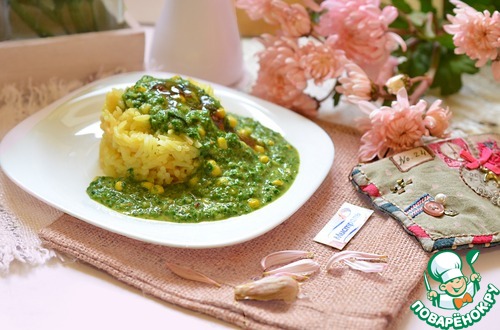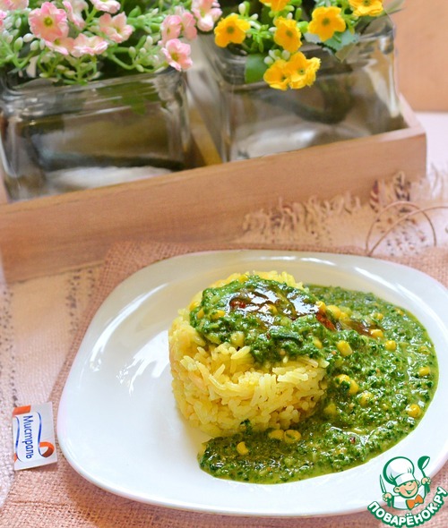 Рецепт «Желтый рис под зелёным ореховым соусом»: