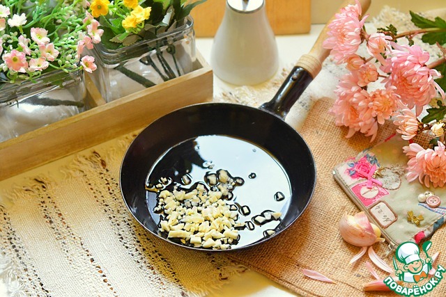 В сковородку налить растительное масло, положить чеснок и обжарить его 1 минуту.