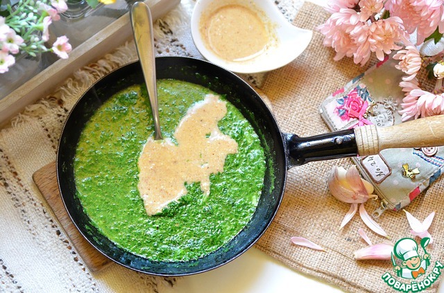 Кунжутную, арахисовую и пасту грецкого ореха добавить в соус. Варить ещё 2-3 минуты. Посолите по вкусу.