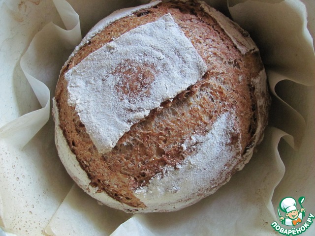 Разогреваем духовку вместе с посудой, в которой будете печь, до температуры 240 градусов. Хлеб переворачиваем на бумагу, делаем надрезы, переносим в посуду, накрываем крышкой и ставим в духовку. Снимаем крышку через 20 минут, снижаем температуру до 180 градусов и допекаем хлеб до готовности. Сегодня пекла с паром. Пар первые 10 минут, духовку проветриваем, снижаем температуру и доводим до готовности.