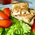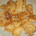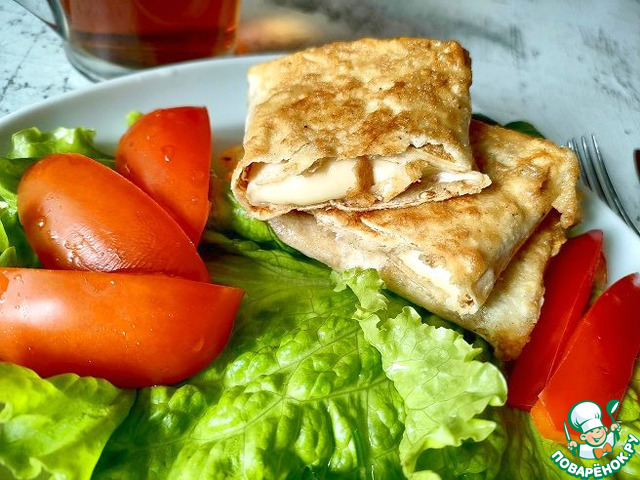 Все в произвольных размерах. Но так, чтоб дважды обвернуть сыр. Взбиваем яйца, без соли. Нагреваем сковороду, масло и, обмакнув хорошенько в яйцо, обжариваем. Жарятся очень быстро. Укладываем на блюдо, посыпаем приправкой. Я сыпала чесночную соль.
