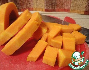 От тыквы отрезаем кусок около 200-250 гр, очищаем, нарезаем кубиками