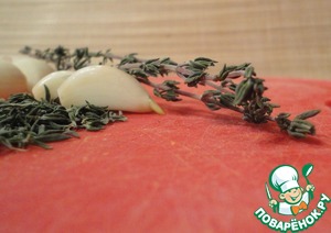 Чеснок разбираем на зубки, очищаем от шелухи, с тимьяна обрываем листочки.