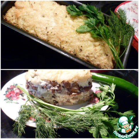 Выкладываем тонким слоем картофель в форму, на него грибы, и так до самого верха формы. Форма у меня 30x10 см и высотой 7 см.