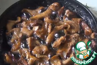 На шпажки нанизать шампиньоны и уложить их на противень. Сверху полить оставшимся в кастрюльке.