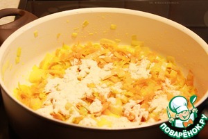• Посыпать мукой овощи перемешать и жарить 1-2 минуты.