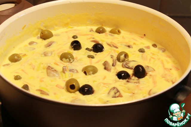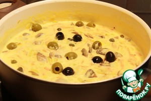 Добавляем маслины, оливки и перемешиваем.