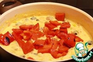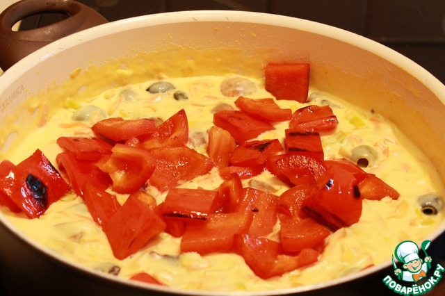 • Далее добавляем обжаренные грибы и перец и тушим еще 2 минуты.