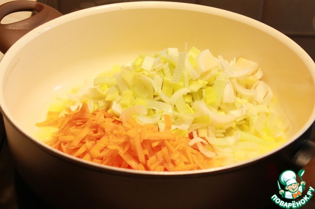 • Морковь и лук помыть почистить. Лук порезать мелко. Морковь натереть на крупной терке. В сковороде растопить подсолнечное и сливочное масло. Обжарить на среднем огне лук и морковь до мягкости.