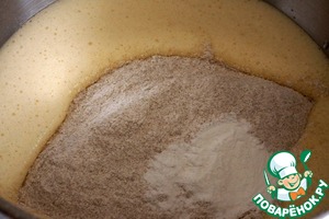 Добавить кефир, слегка перемешаить и добавить просеянную ржаную муку и разрыхлитель.