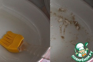 Включить духовку на разогрев до 200 градусов. Форму смазать маслом и слегка присыпать мукой.