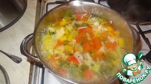 Затем овощи сложить в кастрюлю, залить холодной водой. Варить на маленьком огне минут 10-15 под крышкой, следить, чтобы овощи не разварились.