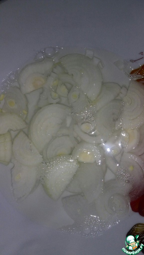 Лук нарезаем полукольцами, и заливаем кипятком на 2 минуты.