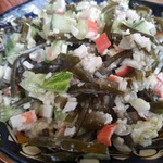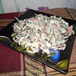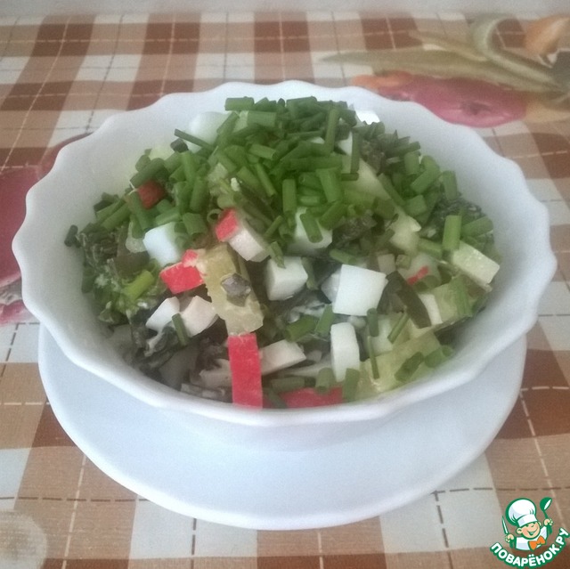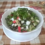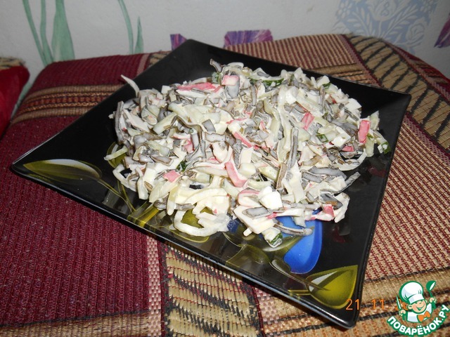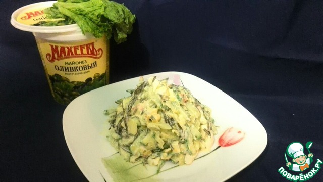 Это очень вкусный, а так же полезный салат, ведь одним из его составляющих является -морская капуста! В ее составе присутствуют альдегиды, а это природные энтеросорбенты, которые могут легко и быстро связывать радионуклиды и выводить их из организма. Также морская водоросль избавит нас от тяжелых металлов в крови, лишнего холестерина. Вот так:)