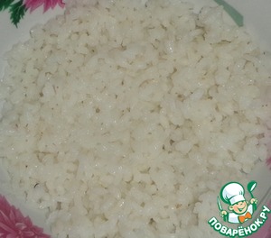 Отварить рис в подсоленной воде до готовности. Откинуть на дуршлаг и промыть водой.