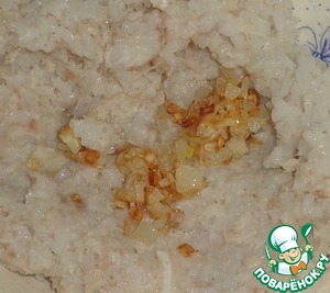 Рыбное филе мелко порезать, посолить по вкусу, добавить душистый перец и имбирь. Перемешать. Затем добавляем отварной рис и обжаренный до золотистого цвета репчатый лук.