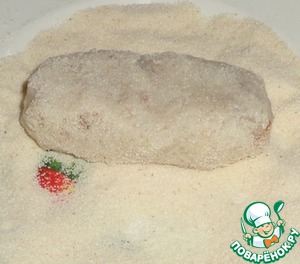 Из рисово-рыбного фарша формирует палочку. Со всех сторон обвалять ее в манной крупе.