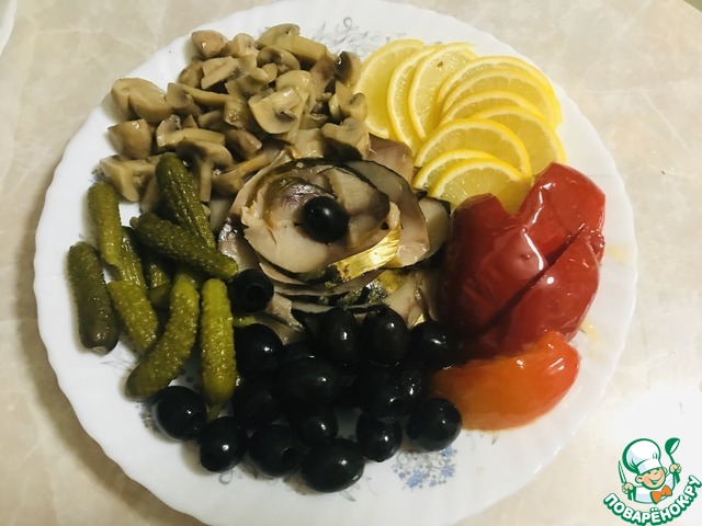 Украшаем по краям луком, оливками, корнишонами, грибами, ломтиками лимона и веточками петрушки.