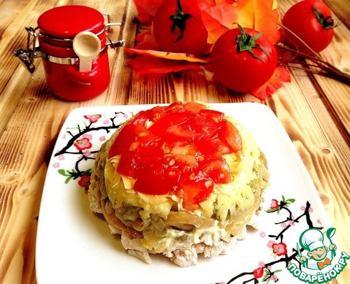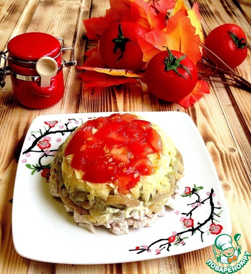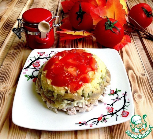 Салат выкладывать слоями, промазывая их майонезом по вкусу: курица, грибы с луком, соленые огурцы, сыр и помидор.