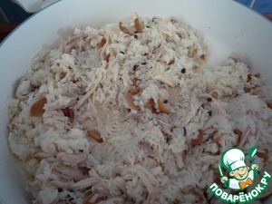 Далее смешать рис с курицей и черным молотым перцем.
