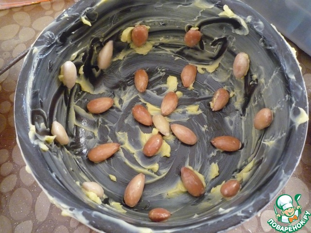 Взять небольшую по ширине, но глубокую форму для выпекания. Хорошо смазать сливочным маслом форму, разложить миндаль.