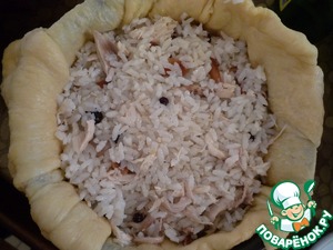 Тесто положить в форму, чтобы края свисали с нее. Выложить на тесто рис с курицей. Закрываем краями теста наш рис. Ставим в разогретую до 175-180 градусов духовку на 40-50 минут.